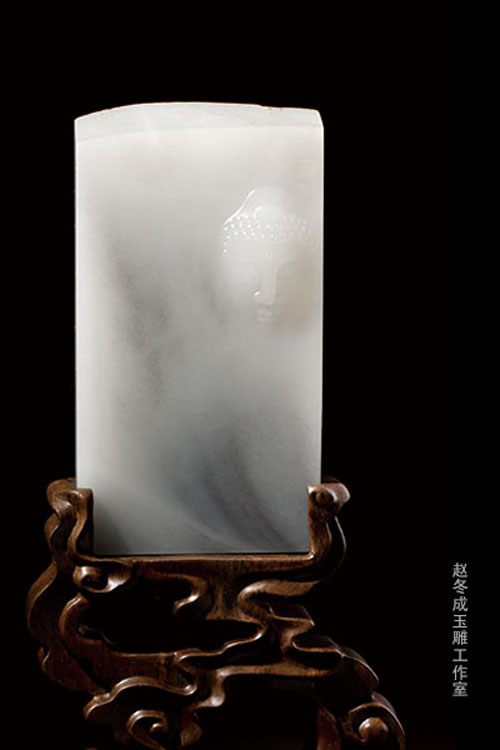 “業(yè)精于勤,勤能補拙”,正是他的一貫堅持和從不間斷的上機實踐,雕刻技法可謂爐火純青。他的玉雕作品以山水、風景、人物、佛像見長,尤其以江南水鄉(xiāng)特色文化為主題的創(chuàng)作更為多見。他的作品從東方美學的自然主義中透射出他對形式的敏感和皈依,多年的修煉和技藝日進讓他在這類題材的創(chuàng)作中得心應手,秉性中流淌的傳統(tǒng)文化情懷沉郁而氤氳,滋養(yǎng)著他的精神和氣質;他的作品以題起意,善于用玉雕的特殊表現(xiàn)形式和獨特語言謀劃和布局唯美畫面,并善于用柔和的手法塑造有對比、有滲透、有層次、有起伏的內在張力之美,使所表現(xiàn)的物象更顯靈動和曼妙,切實體現(xiàn)其畫外之韻。他的作品《梵境》就是充分利用青花原料的天然之美,以傳統(tǒng)審美習慣中對虛靜、空靈的追求為創(chuàng)作方向,利用簡練有力的筆墨,將虛幻無形的佛祖形象厚重地渲染在畫面之上,青花材料自然奔放的色彩效果,似云霧縈繞,一抹青花淡黑似靈山若隱若現(xiàn),又似袈裟飄逸生動,虛中有實,虛實相濟,是古典主義“意境美”的翻版。堪稱“大雅之作”。