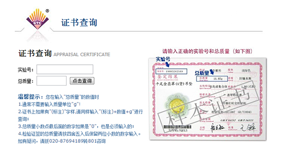 在網(wǎng)絡(luò)數(shù)字化時代,翡翠鑒定機(jī)構(gòu)也緊跟時代步伐,大部分正規(guī)合法的翡翠鑒定機(jī)構(gòu)幾乎都開設(shè)了自己的網(wǎng)站,利用互聯(lián)網(wǎng)為消費(fèi)者提供本機(jī)構(gòu)的翡翠鑒定證書查詢,以便消費(fèi)者能夠輕松的辨別翡翠鑒定證書的真?zhèn)?。一般來說,查詢網(wǎng)址都會標(biāo)注在翡翠鑒定證書上比較醒目的位置,消費(fèi)者只要登陸網(wǎng)址,按照網(wǎng)頁上的提示輸入相關(guān)內(nèi)容,就可以在上面查詢到此翡翠鑒定證書的相關(guān)數(shù)據(jù)(如下圖所示)。