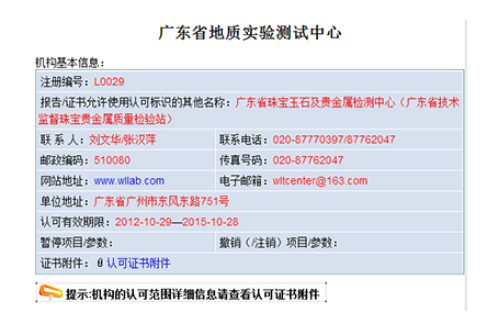 2. 翡翠鑒定證書中CNAS標(biāo)志的下的實(shí)驗(yàn)室編號查詢顯示為:廣東省珠寶玉石及貴金屬檢測中心(下圖)。每一個規(guī)范的翡翠鑒定機(jī)構(gòu)在通過中國合格評定國家認(rèn)可委員會的實(shí)驗(yàn)室認(rèn)證認(rèn)可的時候,都會頒發(fā)一張認(rèn)證認(rèn)可證書,在這個證書上會有這家鑒定機(jī)構(gòu)的完整名稱和認(rèn)證認(rèn)可證書編號,并且這些信息在中國合格評定國家認(rèn)可委員會的官方網(wǎng)站上是可以查詢得到的。所以根據(jù)查詢結(jié)果,這個CNAS標(biāo)志的編號與這張鑒定證書上寫的鑒定機(jī)構(gòu)不相符,也就是平時所說的套牌。