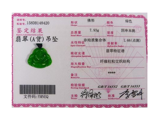 其次,我們要知道一般翡翠鑒定證書上哪些項(xiàng)目是必備的。雖然不同鑒定機(jī)構(gòu)出具的翡翠鑒定證書在部分項(xiàng)目上會有一些差異,但有些項(xiàng)目則是翡翠鑒定證書必須具有的,如翡翠圖片、翡翠的基本物理、化學(xué)、光學(xué)特征(質(zhì)量、折射率、吸收光譜、熒光性、濾色鏡檢查等項(xiàng)目),以及檢測人員的簽字、鋼印和防偽標(biāo)志。這其中,我們首先要看的就是圖片。雖然有些翡翠出自同一塊原料,外表看起來十分相似,但世上絕對沒有一模一樣的兩塊翡翠,因此,我們一定要將實(shí)物與翡翠鑒定證書上的圖片仔細(xì)對比,看看是不是同一件翡翠,如果翡翠鑒定證書上圖片與實(shí)物不符,那后面的內(nèi)容自然就不需要再看了。看完了圖片,確定翡翠鑒定證書上的圖片與我們手中的翡翠實(shí)物是一樣的,那么我們接著要做的就是給翡翠稱重,看看我們稱出的重量是否與翡翠鑒定證書上的一致。通常翡翠鑒定證書上的質(zhì)量一般最少會精確到小數(shù)點(diǎn)后兩位,翡翠實(shí)物的質(zhì)量應(yīng)該與證書上的數(shù)據(jù)相差不大(誤差在0.01-0.05克之間為正常)。
