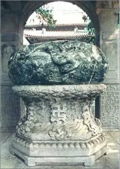多年來,人們一直在尋找“瀆山大玉海”的原配底座,直到1988年,人們才在北京法源寺內發(fā)現了它。該底座有八面八足,為雙層雕,其上雕刻有龍獸、浪花等圖案,刀法圓潤,氣勢雄偉。它與“瀆山大玉海”的玉質、色彩、紋飾風格都高度一致,兩者配放在一起顯得渾然天成。自此,人們一就直期盼著蒙元時期的“瀆山大玉海”早日能團聚,恢復其完整的面貌,煥發(fā)出昔日的雄姿異彩。