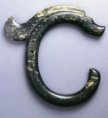 1971年,出土于內蒙古赤峰市翁牛特旗烏丹鎮(zhèn)新地村東拐棒溝紅山文化遺址群中。這條玉龍墨綠色,高26厘米,龍體橫截面為橢圓形,直徑2.3~2.9厘米。體蜷曲,呈C字形。吻部前伸,略向上彎曲,嘴緊閉,有對稱的雙鼻孔,雙眼突起呈棱形,有鬣。頸背有一長鬣,彎曲上卷,長21厘米,占龍體三分之一以上。鬣扁薄,并磨出不顯著的淺凹槽,邊緣打磨銳利。龍身大部光素無紋,只在額及鄂底刻以細密的方格網狀紋,網格突起作規(guī)整的小菱形。玉龍以一整塊玉料圓雕而成,細部還運用了浮雕、淺浮雕等手法,通體琢磨,較為光潔平。