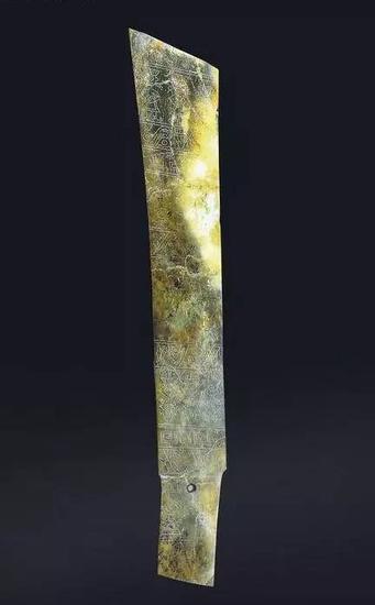 玉神人紋邊璋為國家首批64件禁止出國(境)展覽文物之一。商代晚期文物,1986年出土于四川廣漢三星堆遺址。玉邊璋通長54.5公分,遍體滿飾圖案,生動刻畫了原始宗教祭祀場面。