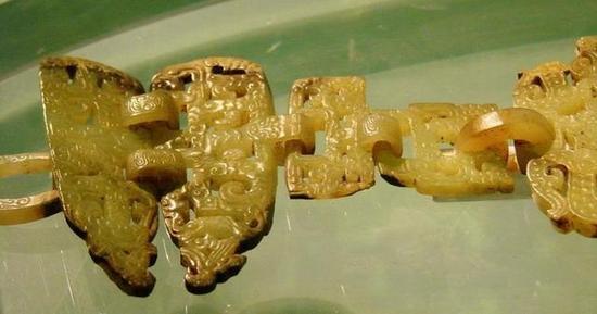所謂活環(huán)套鏈工藝就是把平面“搜鏤”的技巧用于立體“鏤空”上,即在一塊玉料上鏤雕成數個可活動的環(huán)或佩,環(huán)環(huán)相扣環(huán)佩相扣形成連接,使之可卷折可展開,但不可拆卸的一種工藝。此串玉佩是目前面世的器形最長、活環(huán)套鏈最多、紋飾最繁復精美、工藝最為精湛的活環(huán)套鏈玉。此佩的功能和定名目前尚有不同意見,一種看法是用作佩飾,另一種看法是聯(lián)系同時出土的小件玉鳥禽。認為是冠上裝飾,即冠纓。