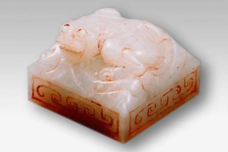 玉“皇后之璽”印,西漢時期的文物,1968年出土于陜西省咸陽市韓家灣狼家溝村?;屎笾t高2厘米,邊長2.8厘米,重33克,以新疆和田羊脂白玉雕成。玉色 純凈無瑕,晶瑩潤澤。玉質堅硬致密,無任何受沁現象。璽體為正方形,鈕為高浮雕的匐伏之螭(chi)虎。螭虎形象兇猛,體態(tài)矯健,四肢有力,雙目圓睜,眼球圓而凸出,隆鼻方唇,張口露齒,雙耳后聳,尾部藏于云紋之中,背部陰刻出一條較粗的隨體擺動的曲線,6顆上齒也以陰線雕琢。螭虎腹下鉆以透孔,以便穿綬系帶。璽臺四側面呈平齊的長方形,并琢出長方形陰線框,其內雕琢出4個互相顛倒并勾連的卷云紋,每個云紋均以雙陰豎線與邊框相連。陰線槽內殘留有部分朱砂。璽面陰刻篆書“皇后之璽”4字,字體結構嚴謹大方,筆畫粗細均勻,深度一致。