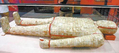 金縷玉衣1968年出土于河北滿城中山靖王劉勝墓。玉衣由頭罩、上身、袖子、手套、褲筒和鞋六個部分組成,全部由玉片拼成,并用金絲加以編綴。玉衣內頭部有玉眼蓋、鼻塞,下腹部有生殖器罩盒和肛門塞。周緣以紅色織物鎖邊,褲筒處裹以鐵條鎖邊,使其加固成型。臉蓋上刻劃眼、鼻、嘴形,胸背部寬闊,臀腹部鼓突,完全似人之體型。全衣共用玉片2498片,金絲約1100克,做工十分精細。玉片成衣后排列整齊,對縫嚴密,表面平整,顏色協(xié)調,反映出玉師杰出的技藝和達官奢侈的生活。