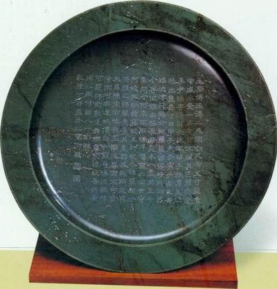 玉刻詩大盤,清代宮藏文物,高9.6厘米口徑65.3厘米。此盤圓形,淺腹,折沿,圈足,光素無紋。盤心鐫刻1762年(乾隆二十七年)御制詩《玉盤謠疊舊作韻有序》,共189字。從文中可知,玉盤為乾隆廿二年(1757年)平定新疆貴族叛亂時繳獲。玉盤體型龐大,打磨潤澤,是新疆玉工的杰作。此盤的刻辭,記錄了重大的歷史事件,有重要歷史文化價值。