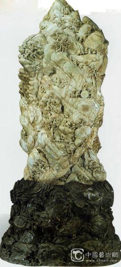 《大禹治水圖》玉山成品于十八世紀清朝乾隆時期。高224厘米,寬96厘米,重約5000公斤,是用最為名貴的密勒塔山和田(舊稱和闐)玉雕成。玉山被置于高60厘米的嵌金絲褐色銅鑄座上,青白玉的晶瑩光澤與雕琢古樸的青褐色銅座相配,更顯得雍容華貴,互映生輝。玉山雕琢的是大禹治水的故事。整個玉山仿佛一座山峰,其上山石林立,山石間飛流直下,山石上人群聚集,揮锨舞鎬,開山移石,疏洪導水,場面恢弘,氣勢非凡。玉師們巧妙地結合材料的原有形狀,靈活安排山水人物,工藝之精美嘆為觀止,不但是一部具有豐富內涵的壯麗史書,也是一件無與倫比的藝術瑰寶。“大禹治水”玉山,是中國玉器寶庫中用料最宏,運路最長,花時最久,費用最昂,雕琢最精,器形最巨,氣魄最大的玉雕工藝品,也是世界上最大的玉雕之一。