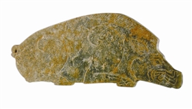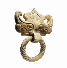 鋪首銜環(huán)一般認(rèn)為是門(mén)扉上的環(huán)形飾物,如《漢書(shū)·哀帝紀(jì)》中記載有“孝元廟殿門(mén)銅龜蛇鋪首鳴。顏師古注:‘門(mén)之鋪首,所以銜環(huán)者也’。”然而在1996年徐州火山劉和墓中出土了一件玉鋪首銜環(huán)(圖5),該佩高6.8、寬5.4厘米。為青白玉質(zhì),局部因受沁呈雞骨白色。整體為一鋪首銜環(huán)造型,鋪首背面飾卷云紋,中間有一圓形扣。結(jié)合鋪首銜環(huán)本身的含義及當(dāng)時(shí)該器出土位置(出土于墓主人玉衣之上)來(lái)看,該器屬于具有厭勝辟邪意味的佩飾玉器。