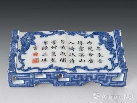 與明清墨床相比,該器物雖然也呈現(xiàn)幾案式樣,但長寬比例趨于正方,不足厘米的高度與明清墨床也迥然有別,雖不若明清墨 床高挺,卻使器物緊貼桌面顯得更加沉穩(wěn)。最有趣的是,到了清乾隆時期,包括墨床在內(nèi)的文房器具開始被大量使用和廣泛流行。墨床的制作材質(zhì),也從古銅、玉 器,發(fā)展到紫檀、陶瓷、漆器、琥珀、瑪瑙、翡翠、景泰藍。墨床的造型也更趨豐富,或曲折,或簡練,除幾案形,還出現(xiàn)了座托形、書卷形、博古架形等。但盡管 材質(zhì)和形制千變?nèi)f化,終究逃脫不了一個簡單的定式:長度往往是寬度的一倍以上。于是,我們在式樣上就發(fā)現(xiàn)了很大的距離——一長一方、一高一矮??此茮]有太 大差異,但這卻是難以逾越的時代鴻溝,是時代審美和時代功用上的差異。