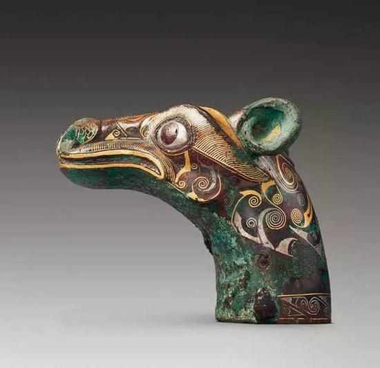 戰(zhàn)國錯金銀馬首形銅轅飾 1951年河南省輝縣固圍村出土 高8.8厘米、長13.7厘米、管徑4.8厘