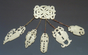 契丹人在制作玉器初期,都是模仿漢人的制作造型。造型分為幾類,第一類是龍、鳳、盤、碗之類的傳統(tǒng)造型,都是漢人所用的東西,契丹人對(duì)中華民族的認(rèn)同感 很強(qiáng),他們認(rèn)為自己不是“外國(guó)人”,也是炎黃子孫,他們對(duì)于祭祀之類的事宜都與傳統(tǒng)基本相同,但用于祭祀的玉器卻與傳統(tǒng)差別很大。比如,傳統(tǒng)捍腰通常是銅 質(zhì)金質(zhì)的,而契丹出土的則為玉質(zhì)捍腰,僅此一件,出土于契丹皇室娘娘之墓。還有用于佛教徒佩掛的瓔珞,契丹出土的瓔珞與普通瓔珞不同,在掛件中間多出一些 類似小管一樣的東西。再比如,雙龍、雙鳳、雙摩羯這種小掛件,是契丹獨(dú)有的樣式。坐龍,則是模仿漢人的傳統(tǒng)物件造型制作的。
