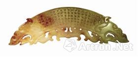 雙龍紋玉璜長20厘米,白玉質(zhì)地,雙面滿工,兩端為張口龍頭,三角眼,長眼線。中部為谷紋,下弦為夔龍,有小穿八孔。其造型古樸,雕琢精美,褐色浸沁斑駁自然,溫潤熟滑而生瑩瑩之輝,是秦漢時期的玉雕飾物。