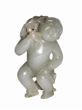 我曾經(jīng)擁有過一件“童子玩蓮”(圖1)小擺件,溫潤、亦好墜、其聲清越、瑕不掩瑜,唯“氣如白虹”略遜一些,依舊十分可愛。當(dāng)然的,美玉琢美器,才有人愛。君看看,“童子玩蓮”琢工細(xì)膩,造型活潑,于是童子肌膚細(xì)嫩,憨態(tài)可掬,動態(tài)逼肖,真是分外的可愛。至于“童子玩蓮”寓有的“連(蓮)生貴子”的瑞芳之意,則更是為“童子玩蓮”錦上添花。