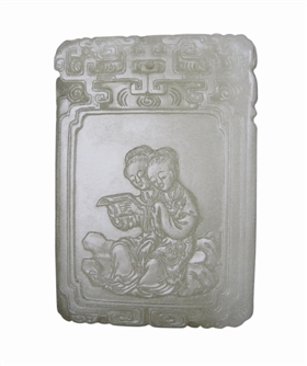 林林總總的百年玉牌中,有不少是可以多說幾句的。比如白玉牌“江東二喬”(圖4),真是瑩潤可人,大喬小喬嫻淑嬌媚,正在庭院中討論書中的什么。人物雖雕琢得情態(tài)俱佳,場景卻僅為園石,似乎單薄了些。但把牌在手凝眸再看,立即便會覺得二喬身后的空緲竟是萬丈硝煙,硝煙中忽見小霸王孫策執(zhí)戟飛馬而來,繼而見火燒赤壁時周郎仗劍仰天大笑,倏忽間閃出個蘇軾,他踏歌而來:遙想公瑾當(dāng)年,小喬初嫁了,雄姿英發(fā)……于是,我便不以為玉牌是玉牌了,是開啟歷史之門的鑰匙!