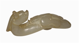 很當(dāng)然的,我的那件漢代玉帶鉤(圖5),像是被地火燒蒸熟了,溫瑩可愛極了,便著實的討人喜歡。帶鉤為母子螭狀,鼻鈕成橢圓形,但鉤身秀美,小小巧巧。我的許多藏品來自湘南、桂西北一帶,玉帶鉤也當(dāng)是南越古國的遺存。面對這枚小小玉帶鉤,君會遐思千里嗎?這般的小,我不敢茍同書上所云是“帶上所嵌掛物鉤”之說。秀美小巧,該不是孩子,抑或又是女兒國里的東西?君不見,長安街上款款而來的二八年歲姑娘,柳腰上的飄忽絲帶,不正是小小玉帶鉤拴結(jié)著的嗎?
