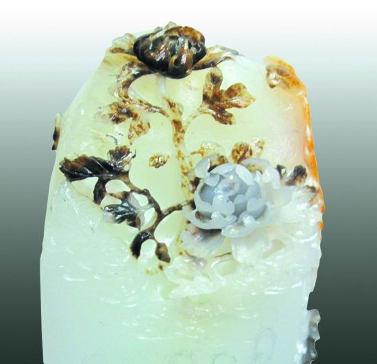 這是一塊圓潤白潔的個性籽玉,天然包裹著一層美麗的皮色,精致神靈的工藝由深漸淺的表現(xiàn)著美好愿望,豐富的層次點(diǎn)出一個富有意趣的主題,而整體構(gòu)架藝術(shù)的表達(dá)出文化內(nèi)涵,然后就是越玩越散發(fā)的絲絲溫暖,在掌上、在心中、在回味里……我想,我的作品跟自己的生活、經(jīng)歷、性格和愛好有關(guān),它可能是雞、魚、花,也可能是鳥,這就是我夢想的作品,那么生動,那么唯美,那么藝術(shù)。