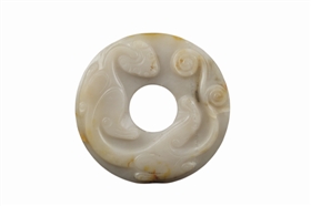 瑪瑙璧(圖2),元代裝飾品,直徑7.5厘米,厚2.3厘米,璧的一面為平面,另一面微凸,上面浮雕一條螭龍,螭龍軀體細長,作爬行狀,螭身隨璧彎曲,翻轉(zhuǎn)自如,螭龍形玉雕軀干細長,動勢起伏大,生動富有神采,為元代極為少見的瑪瑙裝飾品。
