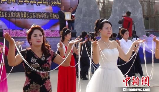 該項(xiàng)鏈由296串且末青白玉打造串聯(lián)而成,寓意為總長400公里的庫—且沙漠公路。表達(dá)了且末各族干部群眾對庫—且沙漠公路能夠早日立項(xiàng)動工、早日通車的一種期盼。”當(dāng)日,由國家文物管理部門當(dāng)場頒發(fā)了世界吉尼斯紀(jì)錄證書。