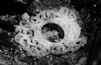這是?;韬钅怪鳂∈页鐾恋凝堷P紋玉佩飾(11月18日攝)。近日,考古工作者在南昌西漢海昏侯墓主槨室東側發(fā)現(xiàn)一件做工精美的玉佩飾,玉佩飾上雕有龍、鳳等圖案。據(jù)考古專家介紹,這塊玉佩飾很可能是韘(音同“射”)形玉佩,質地和工藝都代表漢玉的最高水平,表明墓主人身份和地位的高貴。