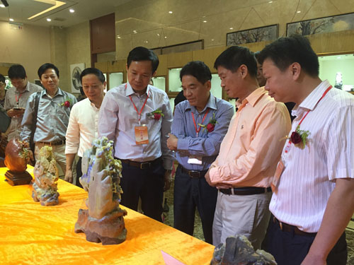 莆田市工藝美術(shù)協(xié)會會長楊鵬飛(右三)和仙游縣有關(guān)領(lǐng)導(dǎo)參觀玉石雕評選會。