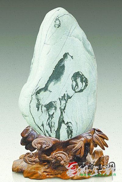 賞石家蒙駟藏有一塊奇石,名為《狼圖騰》。該石產(chǎn)自廣西桂林,屬三江石,表面光滑細(xì)膩,硬度在6.5度以上。它底色發(fā)黑,間有黃色,色差較大。黃色部分形似一匹對月長嘯的草原野狼,畫面遼闊而高遠(yuǎn)。由于石頭上的狼與小說《狼圖騰》的封面圖案極其相似,蒙駟便將它取名為《狼圖騰》。蒙先生十分看重此石,除了因?yàn)樗笮?、比例十分?biāo)準(zhǔn),紋理生動形象外,還因?yàn)槔鞘潜狈讲菰文撩褡宓木裣笳鳎@塊奇石卻產(chǎn)自廣西桂林這一清秀之地,如此反差,體現(xiàn)出大自然的神奇。最為重要的是它表現(xiàn)出了狼的自由、獨(dú)立、頑強(qiáng)、勇敢的精神,以及所具有的野性之美。