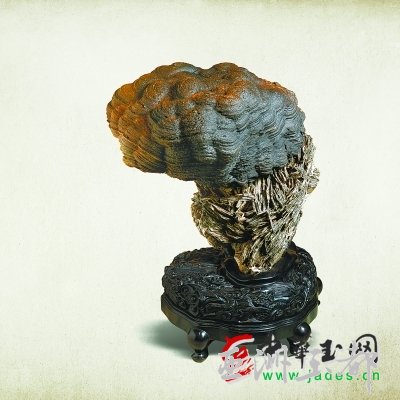 張 永明出自藏石世家,現(xiàn)任天琛奇石博物院院長。他受父親奇石收藏大家張靖的影響,很小便開始收藏奇石。在他眾多的藏品中,戈壁石《靈芝》是心頭之愛?!鹅` 芝》為硅質(zhì)巖,發(fā)現(xiàn)于內(nèi)蒙古阿拉善,長23厘米,寬10厘米,高40厘米,重30公斤。其上部為瑪瑙,用手電照射會透光;下部為集骨石,二者自然生長在一 起,為共生體。整體呈黑色、黃色,狀如靈芝。這塊石之奇除了因?yàn)樗嗡旗`芝,應(yīng)和了靈芝吉祥如意、祥瑞之兆的寓意外,更是源于它被發(fā)現(xiàn)的奇妙過程。