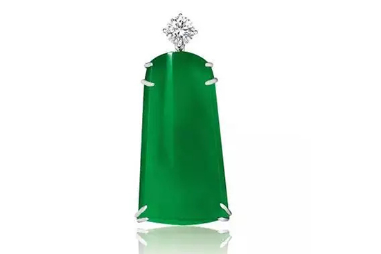 本拍品為18K白金鑲嵌緬甸天然翡翠配鉆石掛墜,附Gubelin證書(shū)特別著錄,香港玉石鑒定中心證書(shū)。翡翠吊墜通體質(zhì)地非常細(xì)密,幼膩純凈,溫軟潤(rùn)澤,種水極美。同時(shí),其色與底融為一體,通體充滿飽滿鮮艷的綠,重彩湛湛。這種綠色只在緬甸出產(chǎn)的翡翠中得以見(jiàn)到,Gubelin在鑒定證書(shū)的特別報(bào)告中,稱之為“帝王綠”。