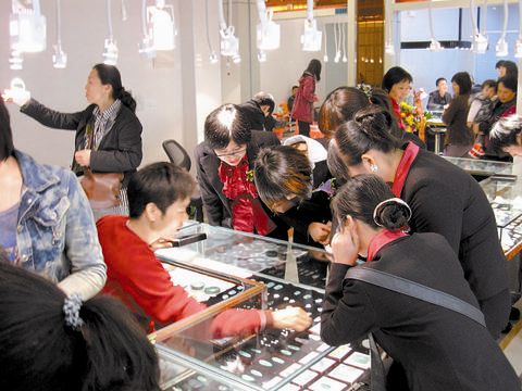 走進(jìn)位于陽美的中國玉都展銷中心,琳瑯滿目的精美翡翠飾品充斥著每個(gè)柜臺(tái)。在一家其貌不揚(yáng)的玉器店門口看到,門外蹲著一群買家,時(shí)而用強(qiáng)光電筒照亮手中的玉鐲并仔細(xì)觀看,時(shí)而按動(dòng)手中的計(jì)算器低聲計(jì)算;店內(nèi)的柜臺(tái)上鋪滿了剛到貨的一批玉鐲,十幾位買家隔著柜臺(tái)邊按計(jì)算機(jī)邊跟老板娘“眉目傳情”,無聲地討價(jià)還價(jià)。穿“城”而過時(shí)發(fā)現(xiàn),盡管客流量不見得很大,但展銷中心里的停車場(chǎng)和街邊都停滿了懸掛著全國各地牌照的小汽車。